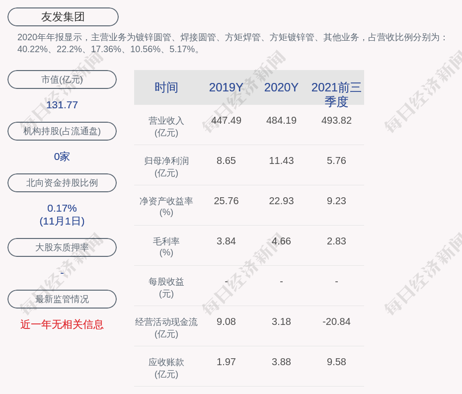 2020年年报显示,友发集团的主营业务为镀锌圆管、焊接圆管、方矩焊管、方矩镀锌管、其他业务,占营收比例分别为:40.22%、22.2%、17.36%、10.56%、5.17%。