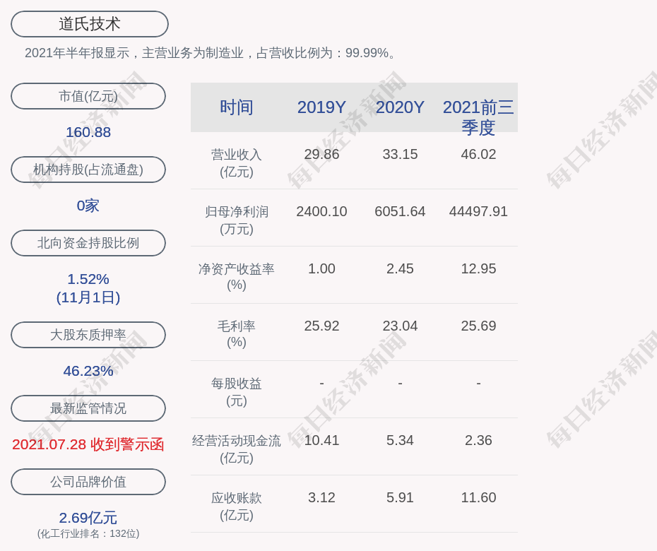 2021年半年报显示,道氏技术的主营业务为制造业,占营收比例为:99.99%。
