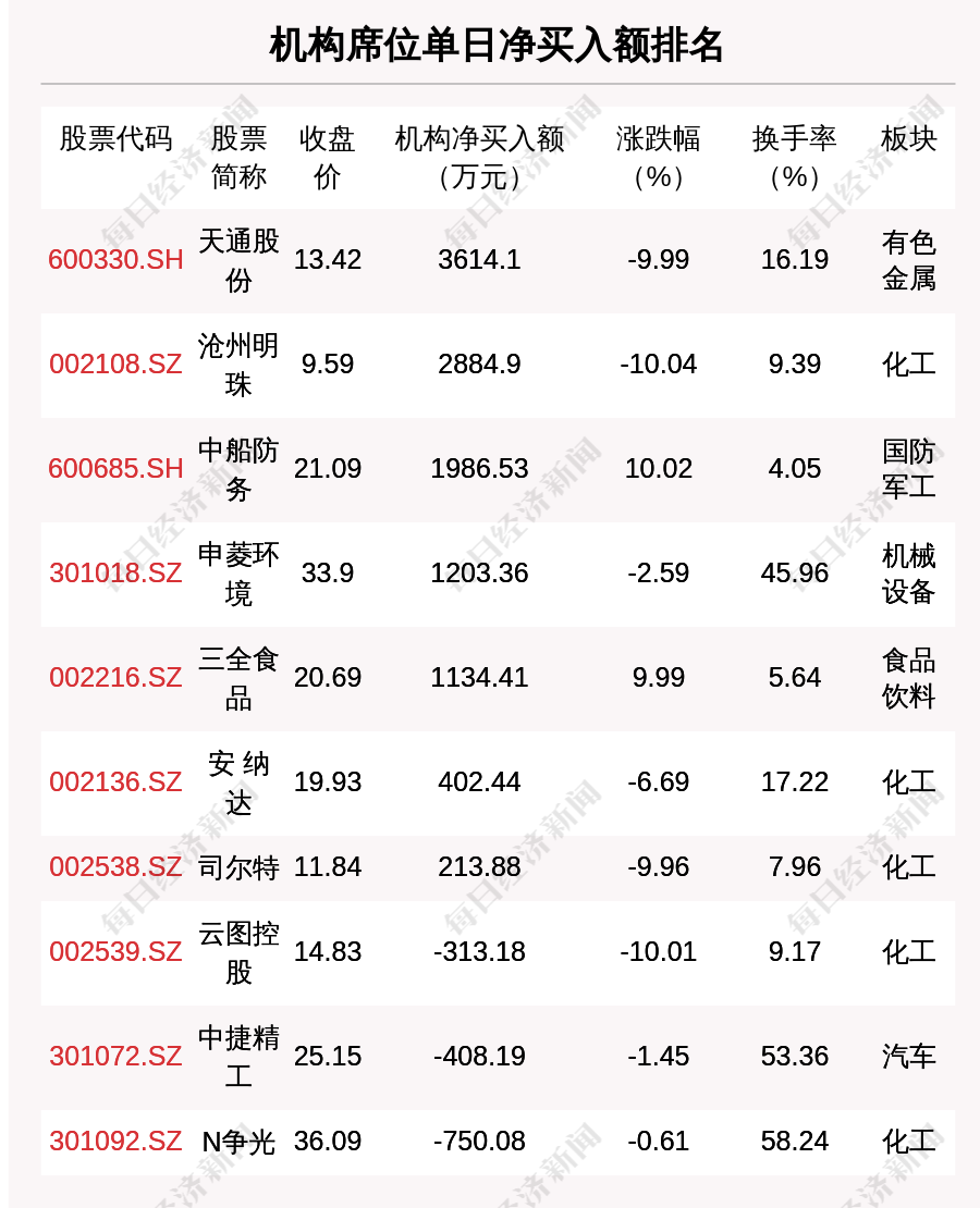 在龙虎榜中,涉及机构专用席位的个股有18只,净买入额前三的是天通股份、沧州明珠、中船防务,分别为3614.1万元、2884.9万元、1986.53万元。