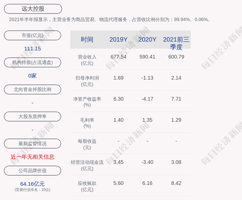 2021年半年报显示,远大控股的主营业务为商品贸易、物流代理服务,占营收比例分别为:99.94%、0.06%。