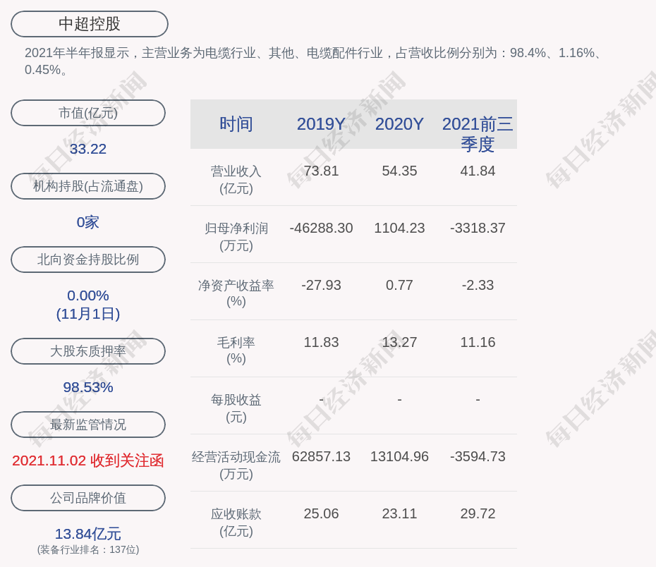 2021年半年报显示,中超控股的主营业务为电缆行业、其他、电缆配件行业,占营收比例分别为:98.4%、1.16%、0.45%。