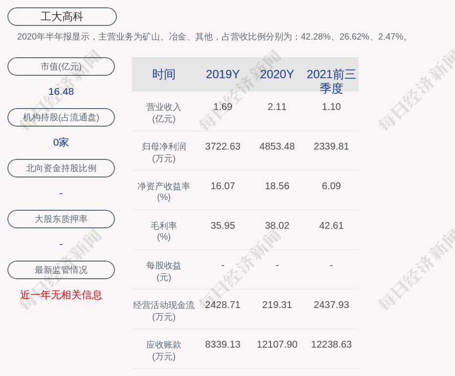 2020年半年报显示,工大高科的主营业务为矿山、冶金、其他,占营收比例分别为:42.28%、26.62%、2.47%。