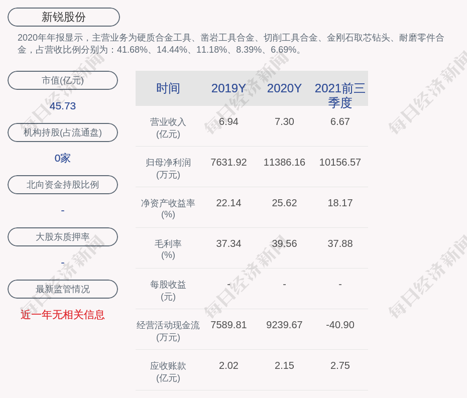 2020年年报显示,新锐股份的主营业务为硬质合金工具、凿岩工具合金、切削工具合金、金刚石取芯钻头、耐磨零件合金,占营收比例分别为:41.68%、14.44%、11.18%、8.39%、6.69%。