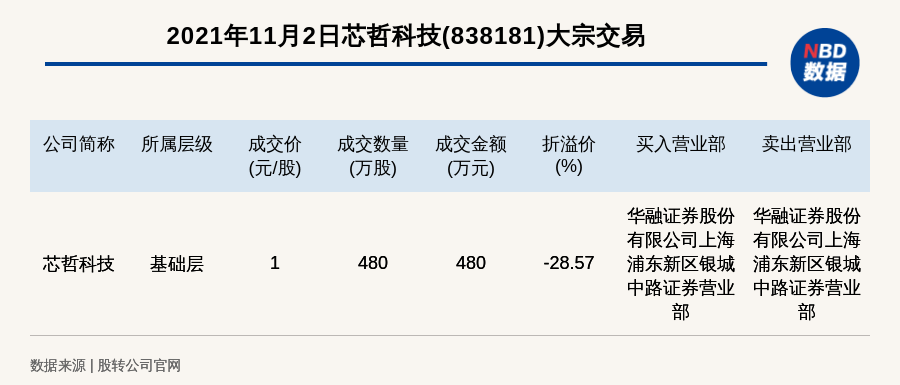 每经讯,2021年11月2日,新三板基础层公司芯哲科技(838181)发生一笔大宗交易,成交价1元/股,成交数量480万股,成交金额480万元,折价28.57%。买入营业部是华融证券股份有限公司上海浦东新区银城中路证券营业部,卖出营业部是华融证券股份有限公司上海浦东新区银城中路证券营业部。