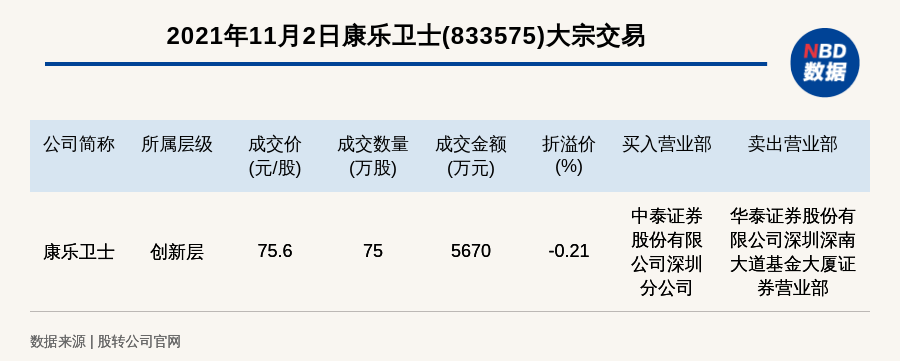 每经讯,2021年11月2日,新三板创新层公司康乐卫士(833575)发生一笔大宗交易,成交价75.6元/股,成交数量75万股,成交金额5670万元,折价0.21%。买入营业部是中泰证券股份有限公司深圳分公司,卖出营业部是华泰证券股份有限公司深圳深南大道基金大厦证券营业部。