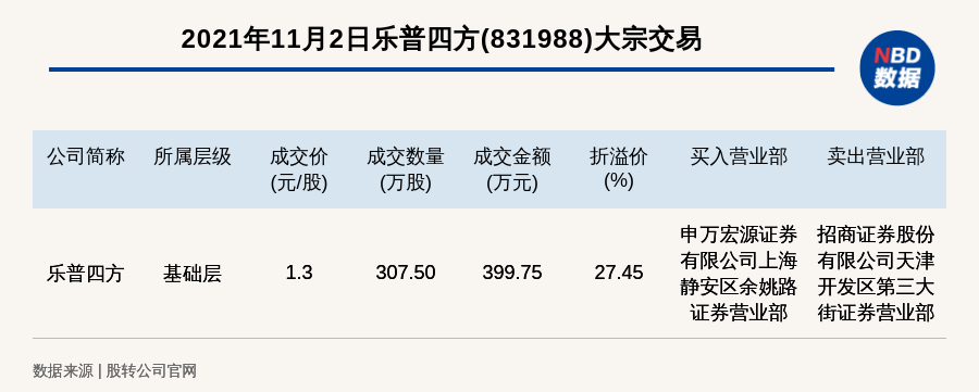 每经讯,2021年11月2日,新三板基础层公司乐普四方(831988)发生一笔大宗交易,成交价1.3元/股,成交数量307.50万股,成交金额399.75万元,溢价27.45%。买入营业部是申万宏源证券有限公司上海静安区余姚路证券营业部,卖出营业部是招商证券股份有限公司天津开发区第三大街证券营业部。