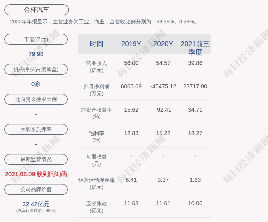 2020年年报显示,金杯汽车的主营业务为工业、商业,占营收比例分别为:88.35%、8.26%。