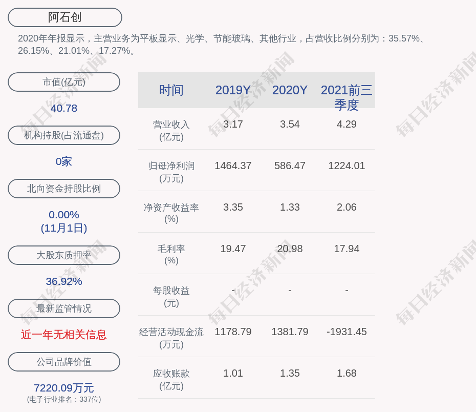 2020年年报显示,阿石创的主营业务为平板显示、光学、节能玻璃、其他行业,占营收比例分别为:35.57%、26.15%、21.01%、17.27%。