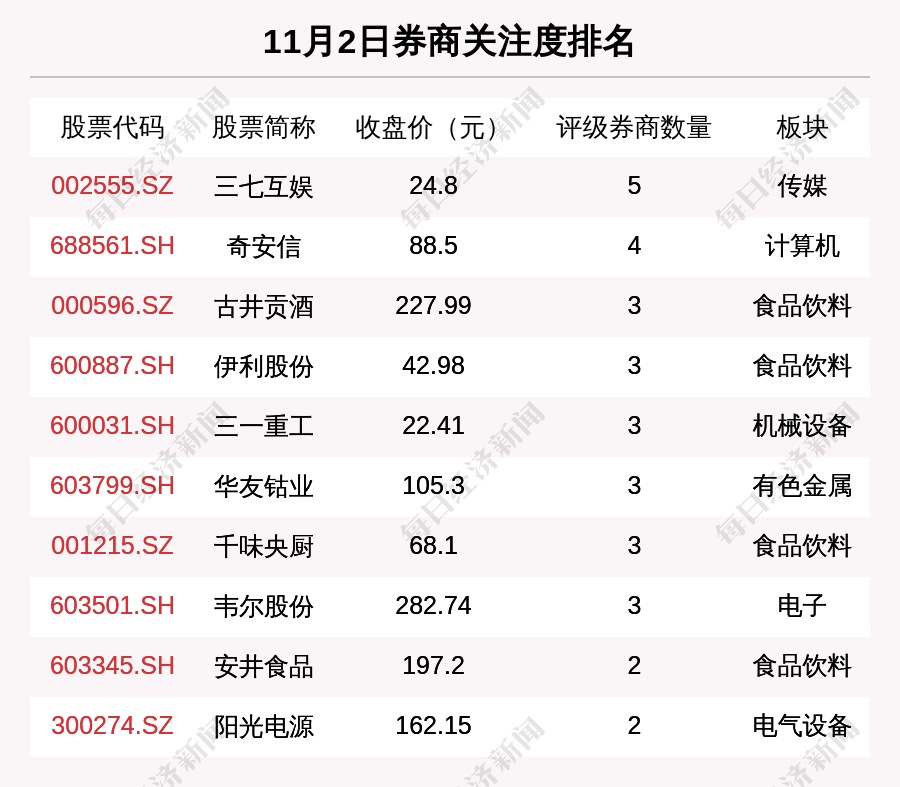 从券商对个股的关注程度来看,有32只个股获得多家券商关注,券商关注数量排名居前的个股是三七互娱(002555.SZ)、奇安信(688561.SH)、古井贡酒(000596.SZ)。