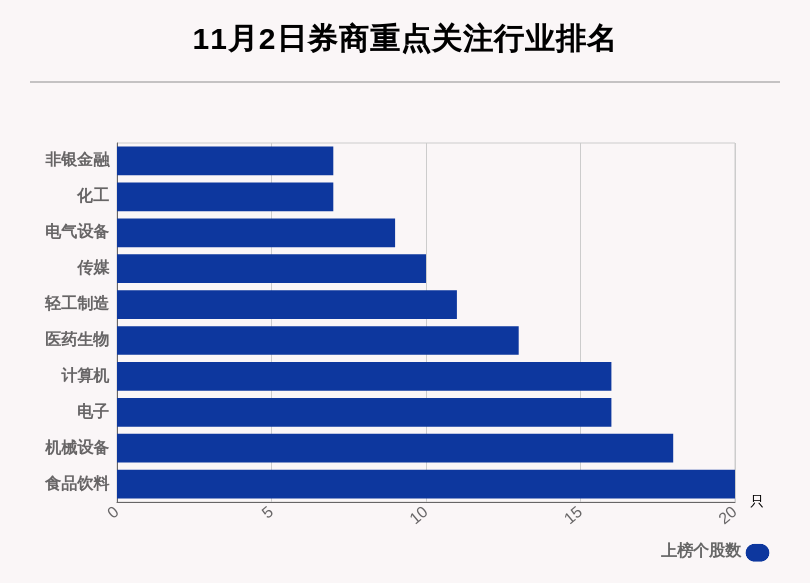 从券商对行业的关注度来看,券商关注个股数居前的行业分别是食品饮料、机械设备、电子。