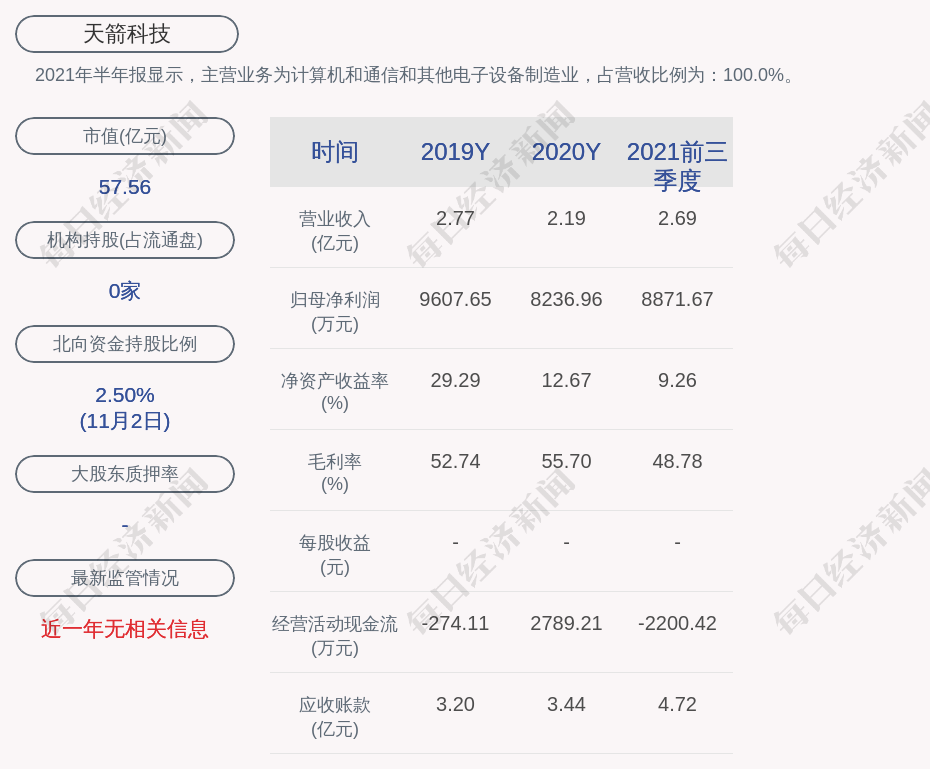 2021年半年报显示,天箭科技的主营业务为计算机和通信和其他电子设备制造业,占营收比例为:100.0%。
