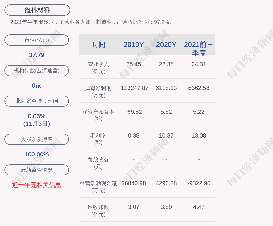2021年半年报显示,鑫科材料的主营业务为加工制造业,占营收比例为:97.2%。