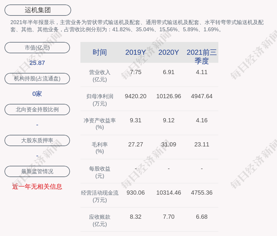 2021年半年报显示,运机集团的主营业务为管状带式输送机及配套、通用带式输送机及配套、水平转弯带式输送机及配套、其他、其他业务,占营收比例分别为:41.82%、35.04%、15.56%、5.89%、1.69%。