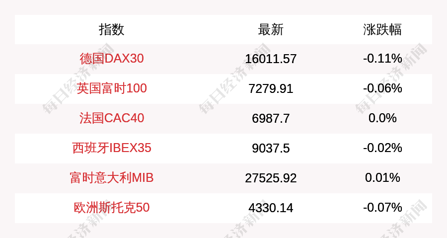每经AI快讯,德国DAX30指数开盘下跌18.08点,跌幅为0.11%;英国富时100指数开盘下跌4.15点,跌幅为0.06%;法国CAC40指数平开;西班牙IBEX35指数开盘下跌1.9点,跌幅为0.02%;富时意大利MIB指数开盘上涨3.87点,涨幅为0.01%;欧洲斯托克50指数开盘下跌3.2点,跌幅为0.07%。