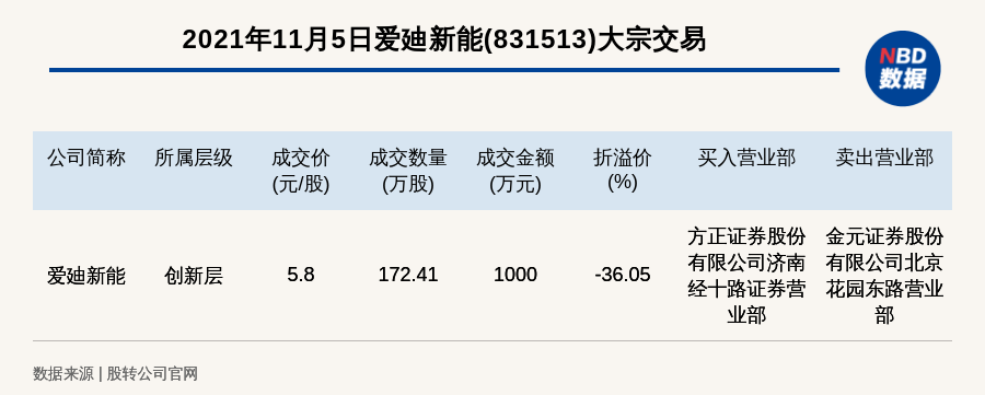 每经讯,2021年11月5日,新三板创新层公司爱廸新能(831513)发生一笔大宗交易,成交价5.8元/股,成交数量172.41万股,成交金额1000万元,折价36.05%。买入营业部是方正证券股份有限公司济南经十路证券营业部,卖出营业部是金元证券股份有限公司北京花园东路营业部。