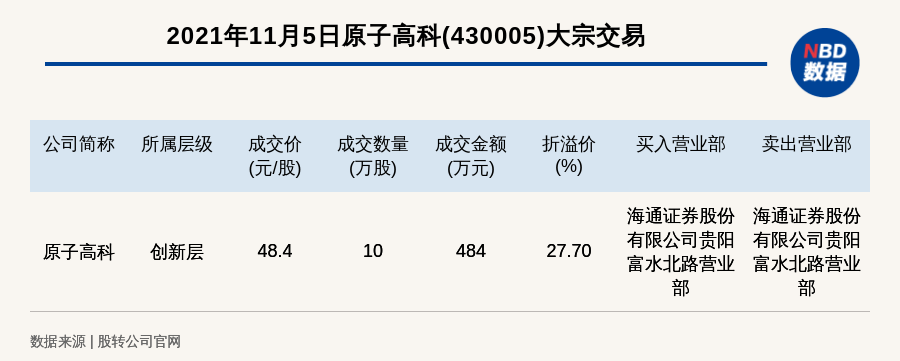 每经讯,2021年11月5日,新三板创新层公司原子高科(430005)发生一笔大宗交易,成交价48.4元/股,成交数量10万股,成交金额484万元,溢价27.7%。买入营业部是海通证券股份有限公司贵阳富水北路营业部,卖出营业部是海通证券股份有限公司贵阳富水北路营业部。