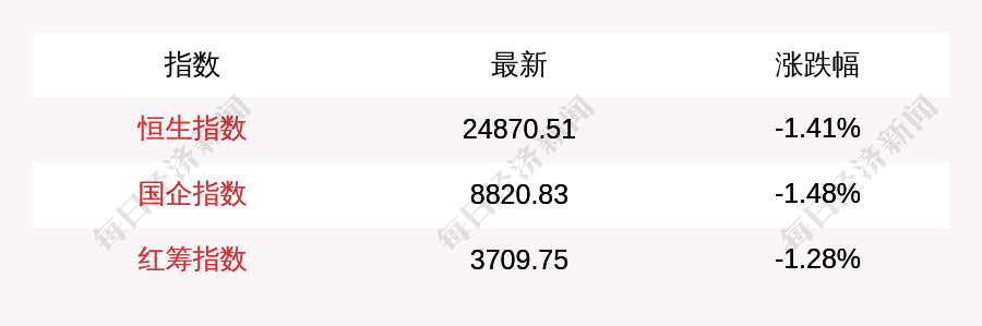 每经AI快讯:北京时间11月5日16:00,恒生指数收盘下跌354.68点,跌幅为1.41%,报收24870.51点;国企指数收盘下跌132.29点,跌幅为1.48%,报收8820.83点;红筹指数收盘下跌48.11点,跌幅为1.28%,报收3709.75点。南向资金当日净流入8.81亿元。