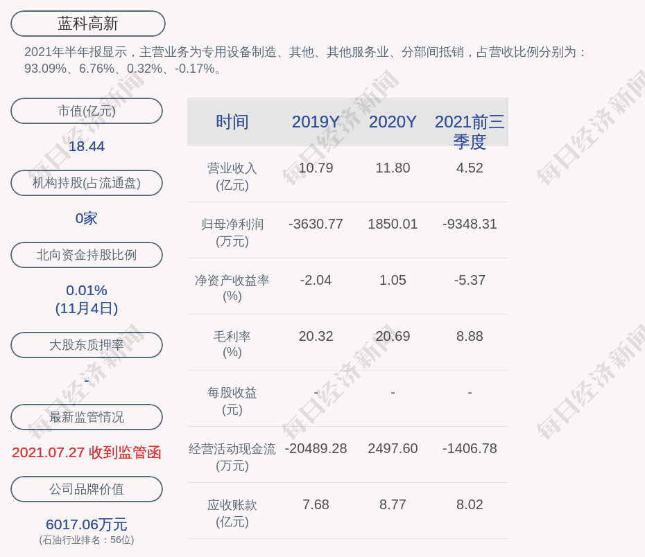 2021年半年报显示,蓝科高新的主营业务为专用设备制造、其他、其他服务业、分部间抵销,占营收比例分别为:93.09%、6.76%、0.32%、-0.17%。