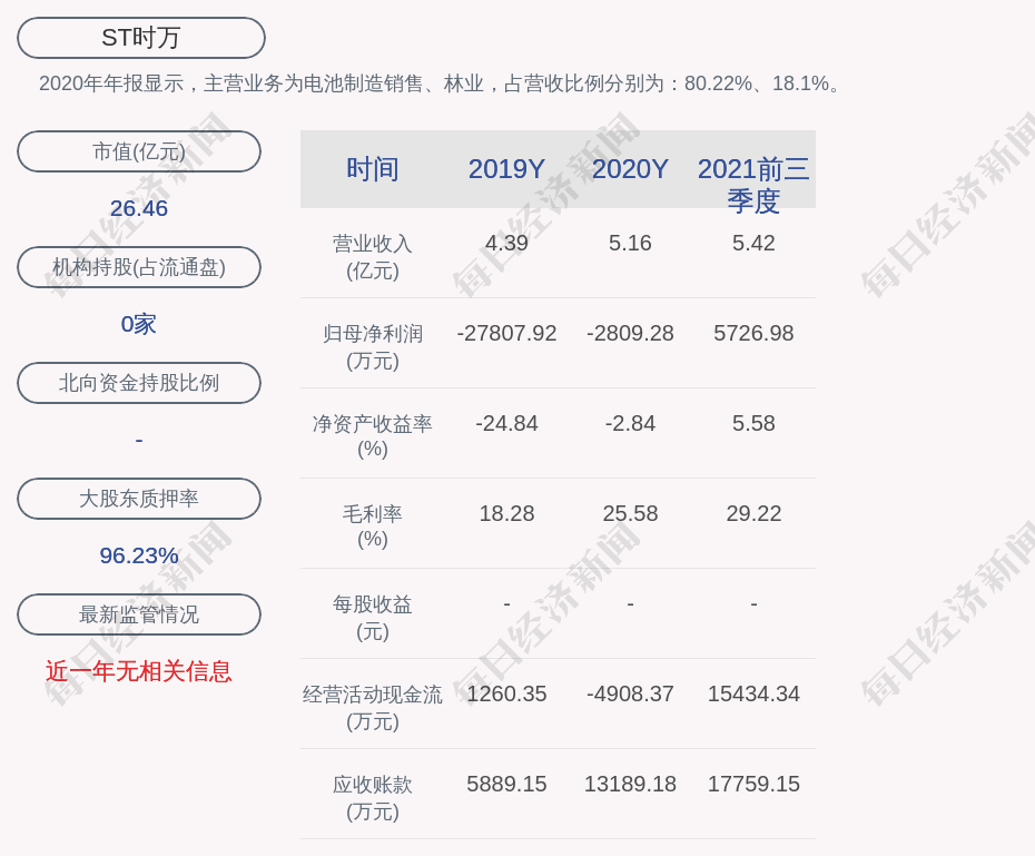 2020年年报显示,ST时万的主营业务为电池制造销售、林业,占营收比例分别为:80.22%、18.1%。