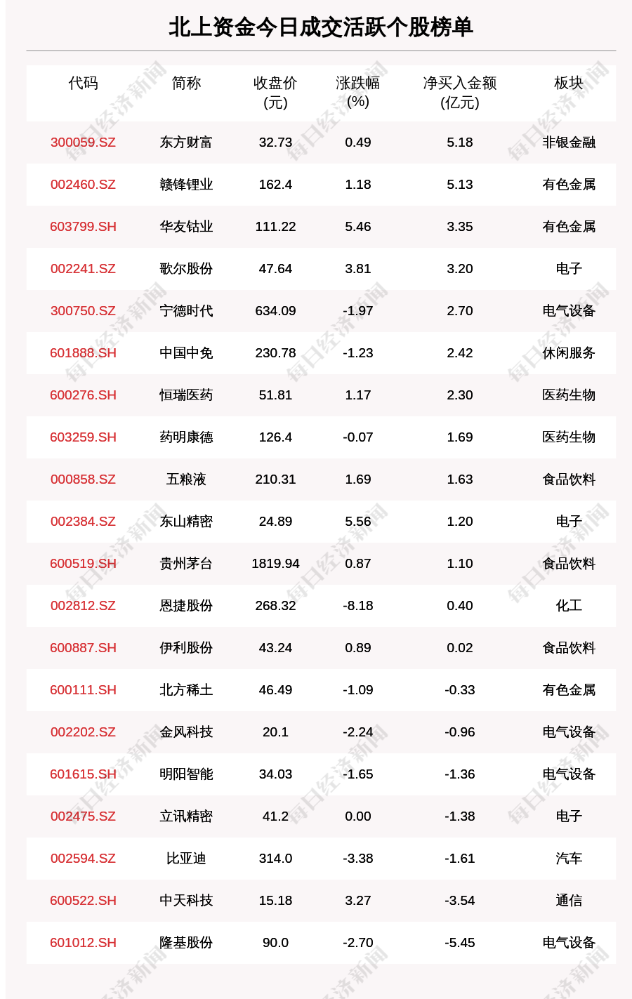 11月5日,北上资金成交活跃个股榜单中,净买入个股共13只,金额最多的是东方财富(300059.SZ,收盘价:32.73元),净买入5.178亿元;净卖出个股共7只,金额最多的是隆基股份(601012.SH,收盘价:90.0元),净卖出5.450亿元。