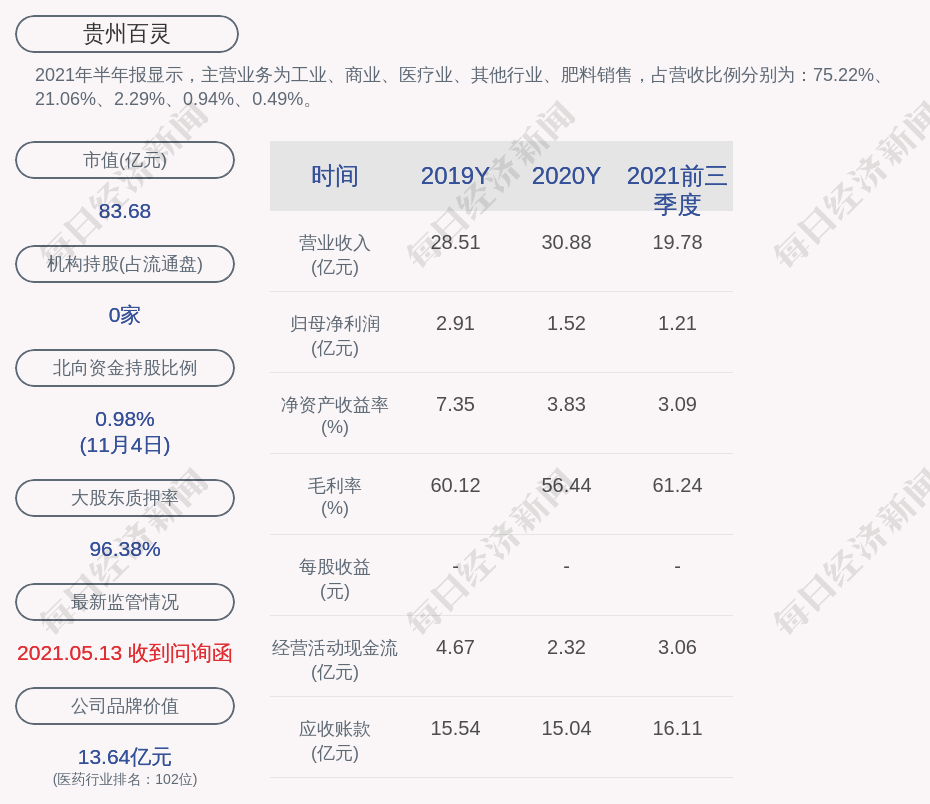 2021年半年报显示,贵州百灵的主营业务为工业、商业、医疗业、其他行业、肥料销售,占营收比例分别为:75.22%、21.06%、2.29%、0.94%、0.49%。