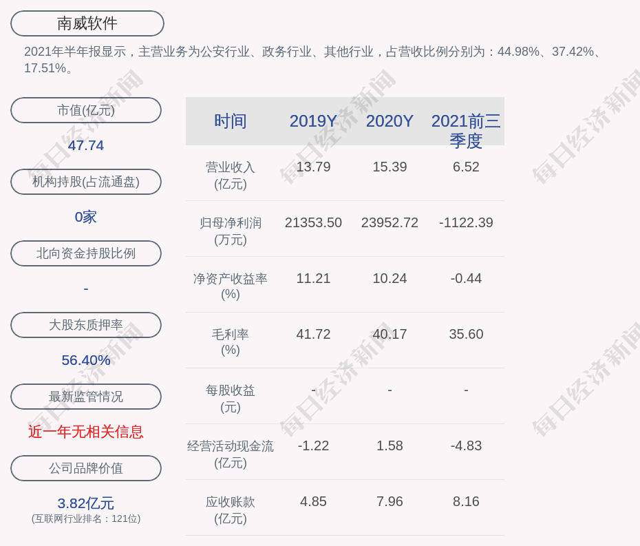 2021年半年报显示,南威软件的主营业务为公安行业、政务行业、其他行业,占营收比例分别为:44.98%、37.42%、17.51%。