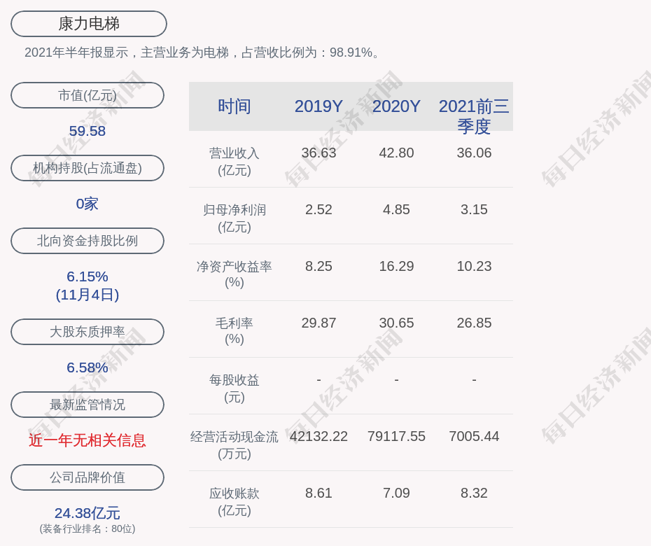 2021年半年报显示,康力电梯的主营业务为电梯,占营收比例为:98.91%。