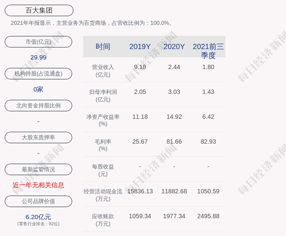 2021年年报显示,百大集团的主营业务为百货商场,占营收比例为:100.0%。