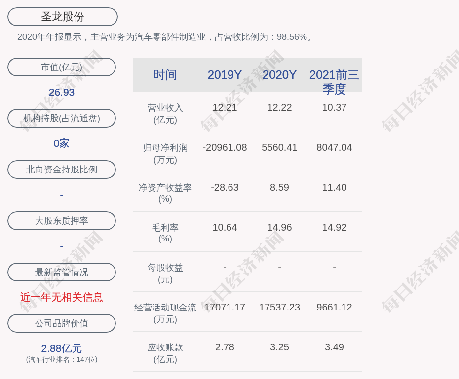 2020年年报显示,圣龙股份的主营业务为汽车零部件制造业,占营收比例为:98.56%。