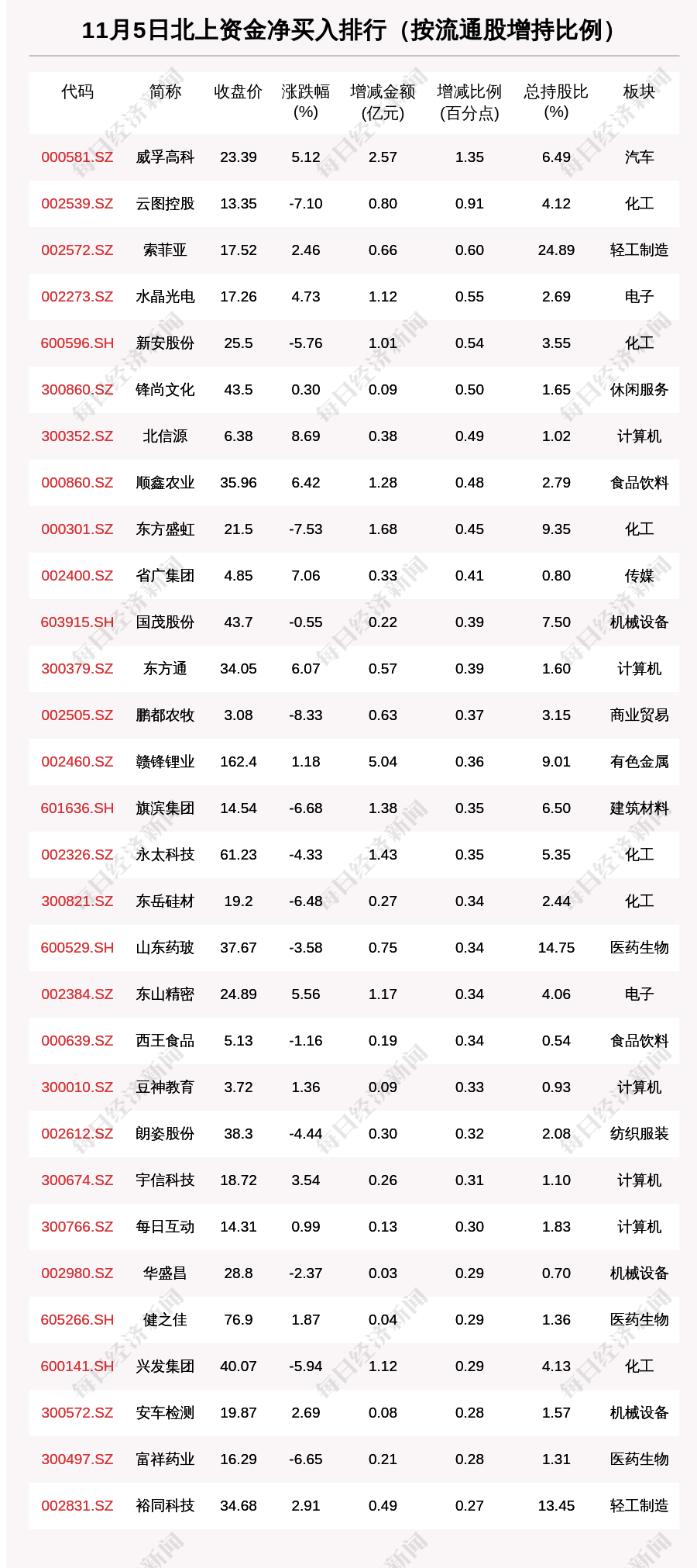 每经AI快讯,11月5日,北上资金净买入的个股共有573只,北上资金加仓比例超1%的有485只。其中,威孚高科(000581.SZ,收盘价:23.39元)加仓比例最为明显,最新持股比例6.49%,环比增加1.35个百分点。其他北上资金加仓比例较多的个股还包括云图控股(002539.SZ,收盘价:13.35元)、索菲亚(002572.SZ,收盘价:17.52元)、水晶光电(002273.SZ,收盘价:17.26元)。