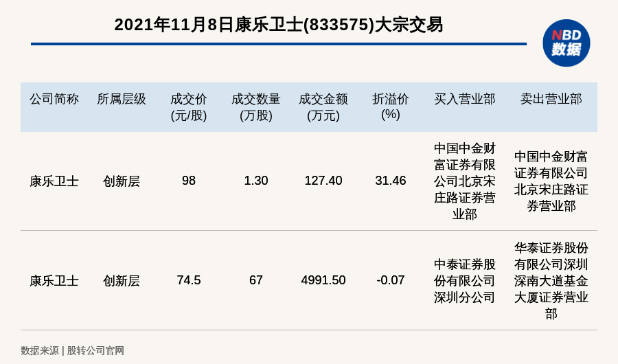 每经讯,2021年11月8日,新三板创新层公司康乐卫士(833575)发生2笔大宗交易,溢价率最高的一笔成交价98元/股,成交数量1.30万股,成交金额127.40万元,溢价31.46%。买入营业部是中国中金财富证券有限公司北京宋庄路证券营业部,卖出营业部是中国中金财富证券有限公司北京宋庄路证券营业部。