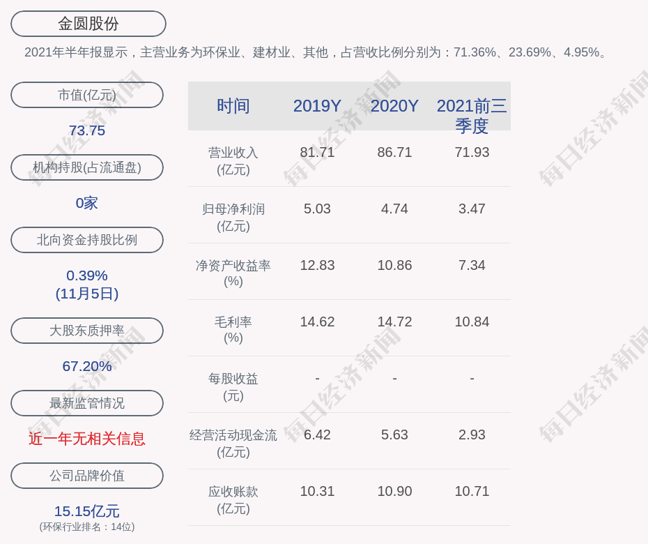 2021年半年报显示,金圆股份的主营业务为环保业、建材业、其他,占营收比例分别为:71.36%、23.69%、4.95%。