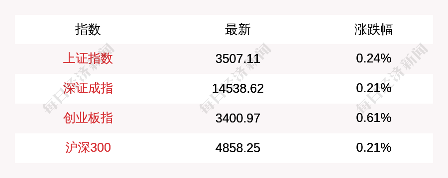 每经AI快讯:北京时间11月9日9:30,上证指数开盘上涨8.48点,涨幅为0.24%,报3507.11点;深证成指开盘上涨29.76点,涨幅为0.21%,报14538.62点;创业板指开盘上涨20.68点,涨幅为0.61%,报3400.97点;沪深300开盘上涨10.07点,涨幅为0.21%,报4858.25点。