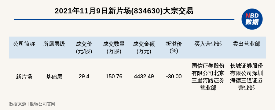 每经讯,2021年11月9日,新三板基础层公司新片场(834630)发生一笔大宗交易,成交价29.4元/股,成交数量150.76万股,成交金额4432.49万元,折价30%。买入营业部是国信证券股份有限公司北京三里河路证券营业部,卖出营业部是长城证券股份有限公司深圳海德三道证券营业部。