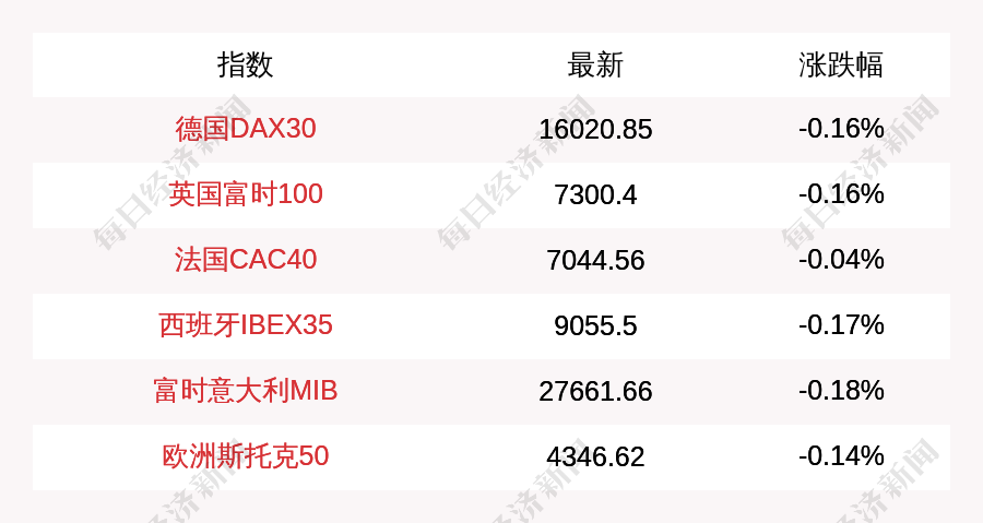 每经AI快讯:北京时间11月9日16:00,德国DAX30指数开盘下跌25.67点,跌幅为0.16%,报16020.85点;英国富时100指数开盘下跌11.33点,跌幅为0.16%,报7289.07点;法国CAC40指数开盘下跌2.92点,跌幅为0.04%,报7044.56点;西班牙IBEX35指数开盘下跌15.3点,跌幅为0.17%,报9055.5点;富时意大利MIB指数开盘下跌49.43点,跌幅为0.18%,报27661.66点;欧洲斯托克50指数开盘下跌5.91点,跌幅为0.14%,报4346.62点。