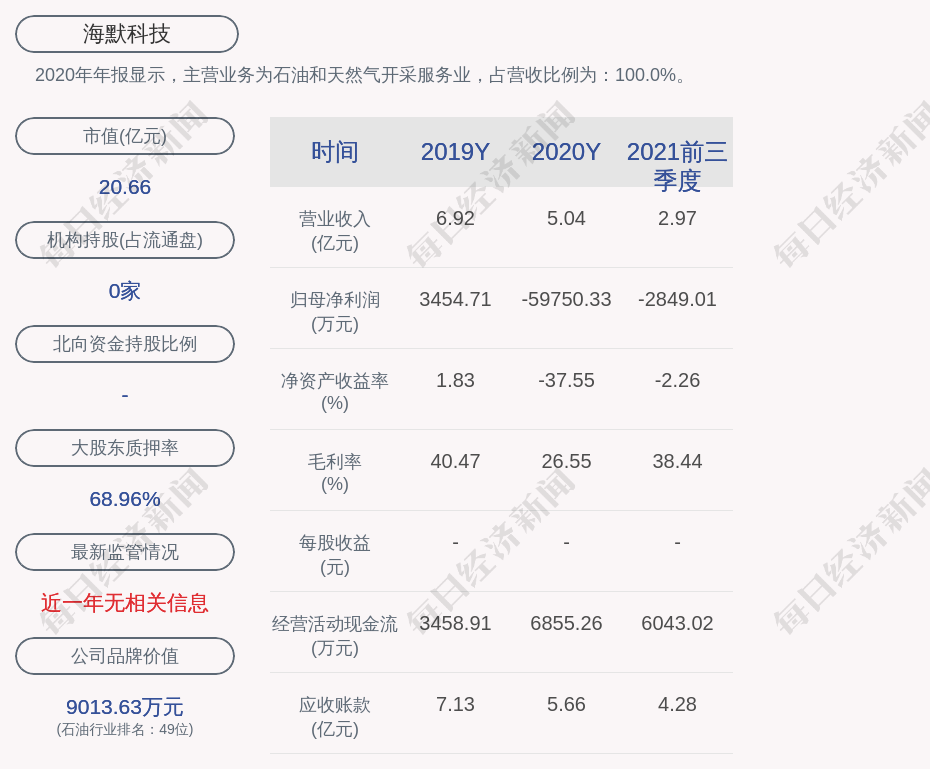 2020年年报显示,海默科技的主营业务为石油和天然气开采服务业,占营收比例为:100.0%。