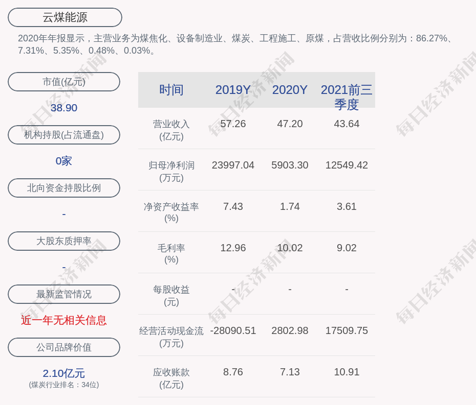 2020年年报显示,云煤能源的主营业务为煤焦化、设备制造业、煤炭、工程施工、原煤,占营收比例分别为:86.27%、7.31%、5.35%、0.48%、0.03%。