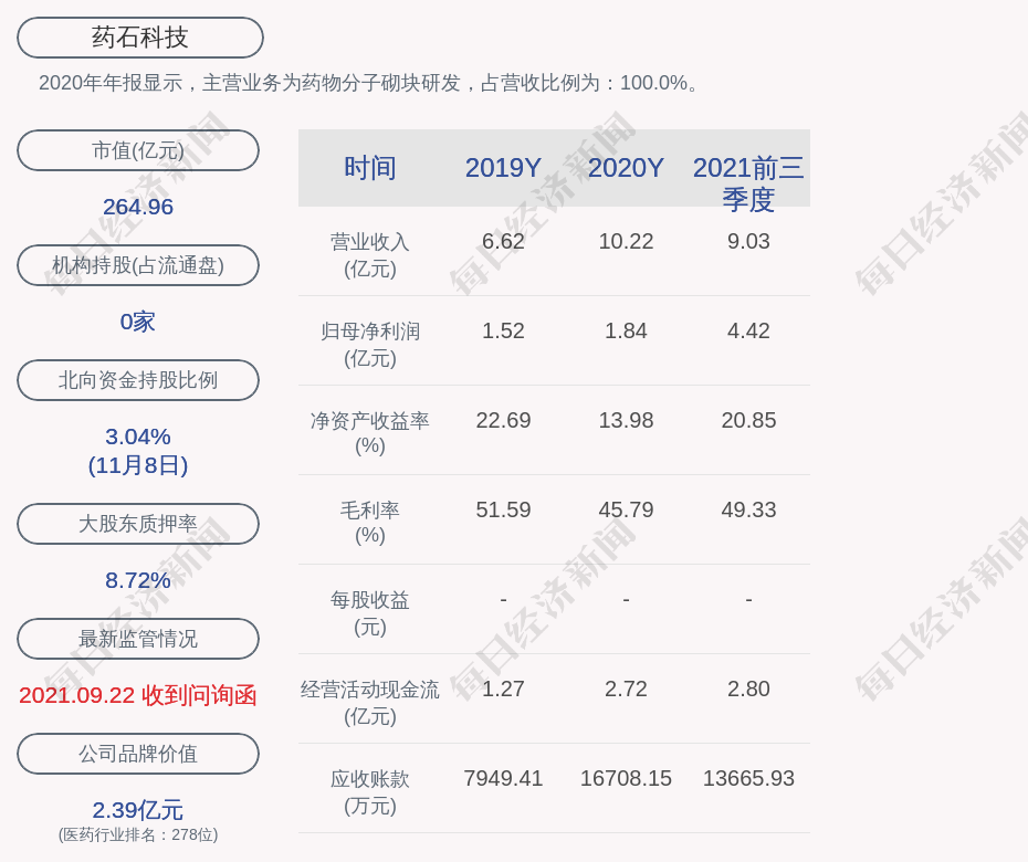 2020年年报显示,药石科技的主营业务为药物分子砌块研发,占营收比例为:100.0%。