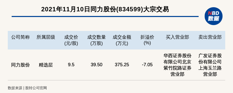 每经讯,2021年11月10日,新三板精选层公司同力股份(834599)发生一笔大宗交易,成交价9.5元/股,成交数量39.50万股,成交金额375.25万元,折价7.05%。买入营业部是华西证券股份有限公司北京紫竹院路证券营业部,卖出营业部是广发证券股份有限公司上海玉兰路营业部。