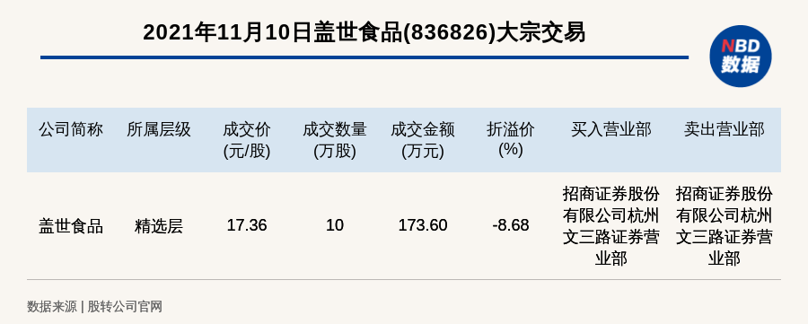 每经讯,2021年11月10日,新三板精选层公司盖世食品(836826)发生一笔大宗交易,成交价17.36元/股,成交数量10万股,成交金额173.60万元,折价8.68%。买入营业部是招商证券股份有限公司杭州文三路证券营业部,卖出营业部是招商证券股份有限公司杭州文三路证券营业部。