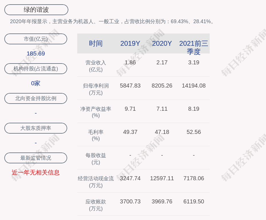 2020年年报显示,绿的谐波的主营业务为机器人、一般工业,占营收比例分别为:69.43%、28.41%。