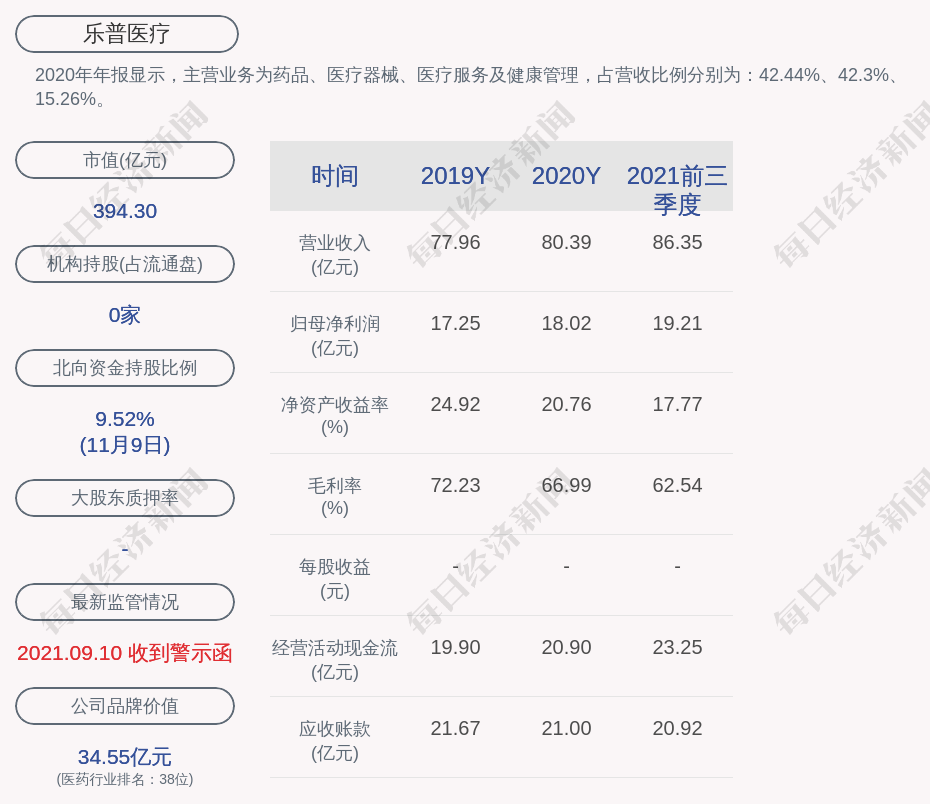 2020年年报显示,乐普医疗的主营业务为药品、医疗器械、医疗服务及健康管理,占营收比例分别为:42.44%、42.3%、15.26%。
