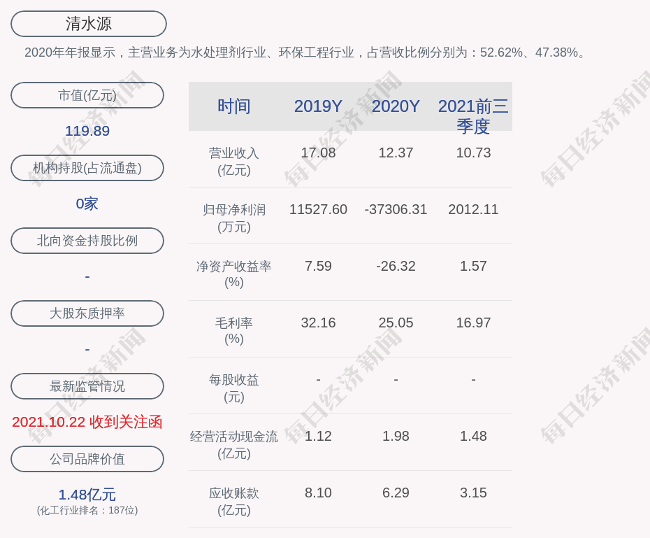 2020年年报显示,清水源的主营业务为水处理剂行业、环保工程行业,占营收比例分别为:52.62%、47.38%。