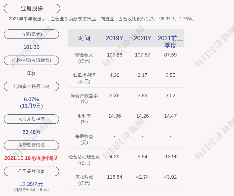 2021年半年报显示,亚厦股份的主营业务为建筑装饰业、制造业,占营收比例分别为:96.37%、2.76%。