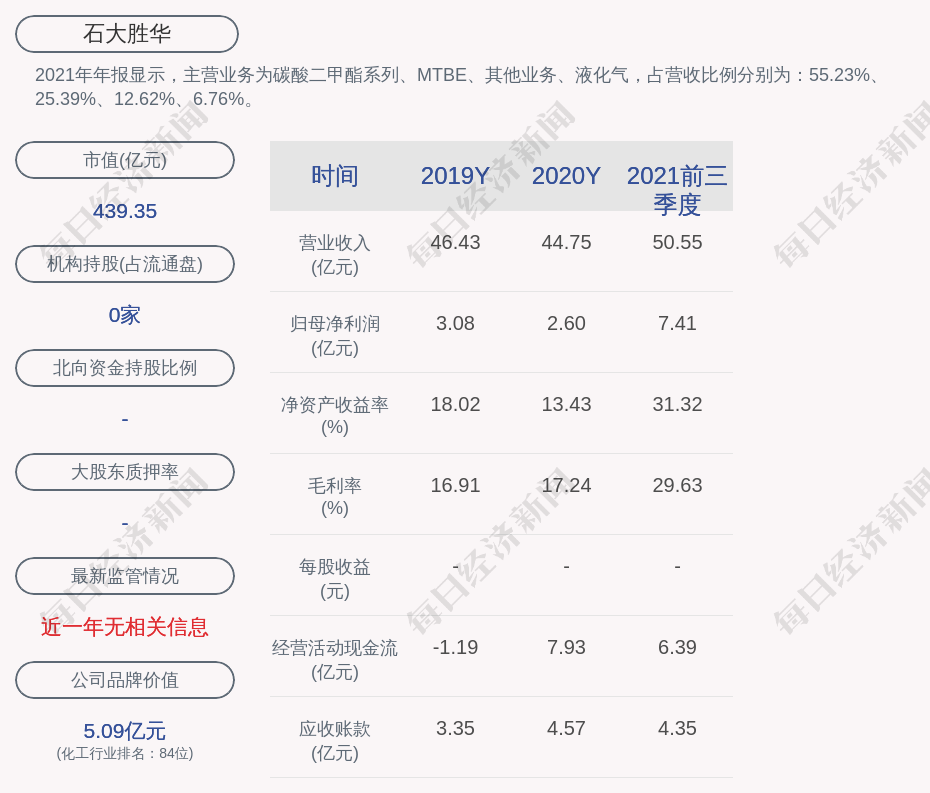 2. 石大胜华在近3个交易日上涨21.25%,所属化工板块同期上涨1.6%,上证指数同期上涨0.03%。更多关键信息,请搜索“道达号”。