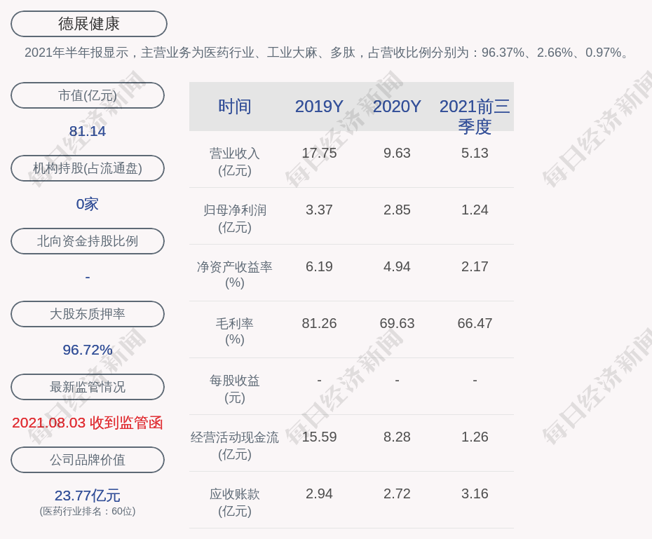 2021年半年报显示,德展健康的主营业务为医药行业、工业大麻、多肽,占营收比例分别为:96.37%、2.66%、0.97%。