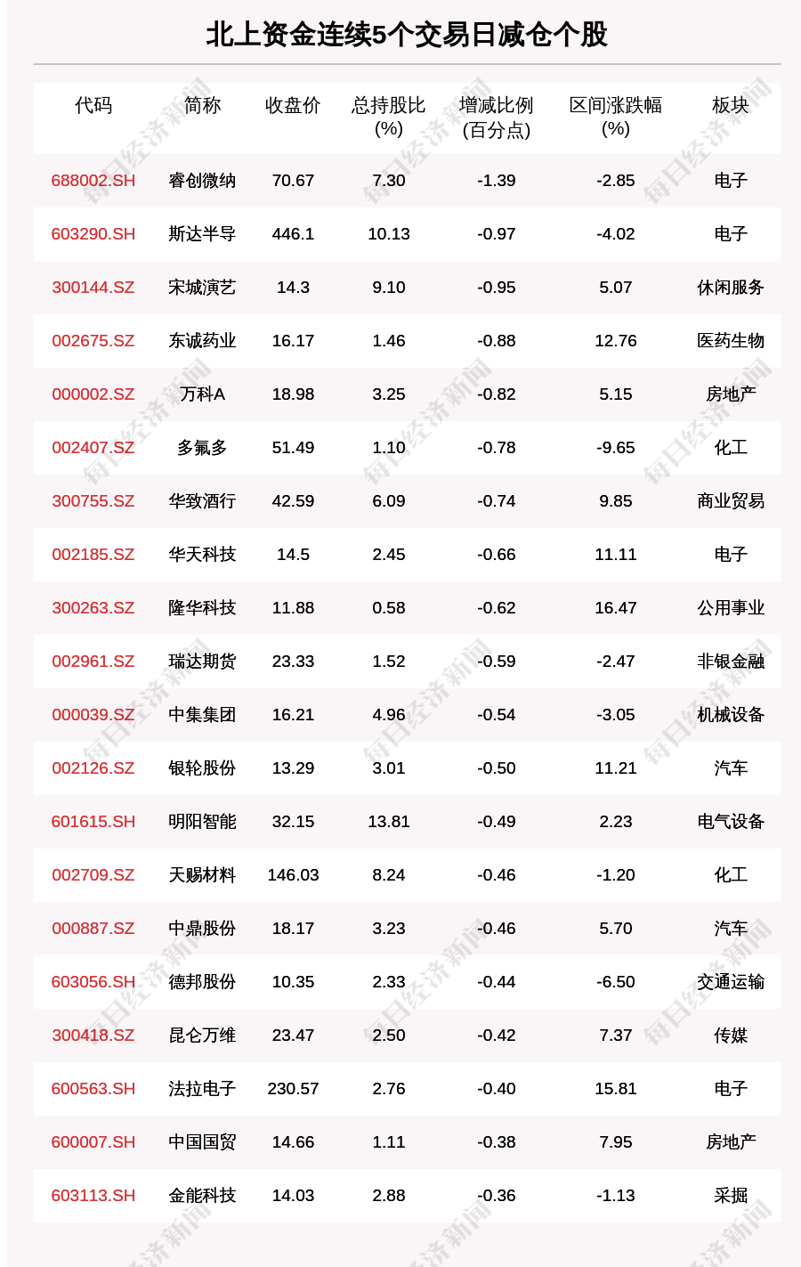 每经AI快讯,11月10日,北上资金连续5个交易日卖出81个股。北上资金连续5个交易日减仓个股中,睿创微纳(688002.SH,收盘价:70.67元)减持比例增幅最大,5个交易日减持1.39百分点,其他跌幅较大的个股包括斯达半导(603290.SH,收盘价:446.1元)、宋城演艺(300144.SZ,收盘价:14.3元)、东诚药业(002675.SZ,收盘价:16.17元),分别减持0.97个百分点、0.95个百分点、0.88个百分点。