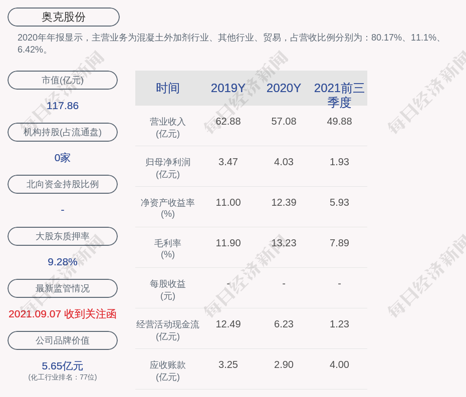 2020年年报显示,奥克股份的主营业务为混凝土外加剂行业、其他行业、贸易,占营收比例分别为:80.17%、11.1%、6.42%。