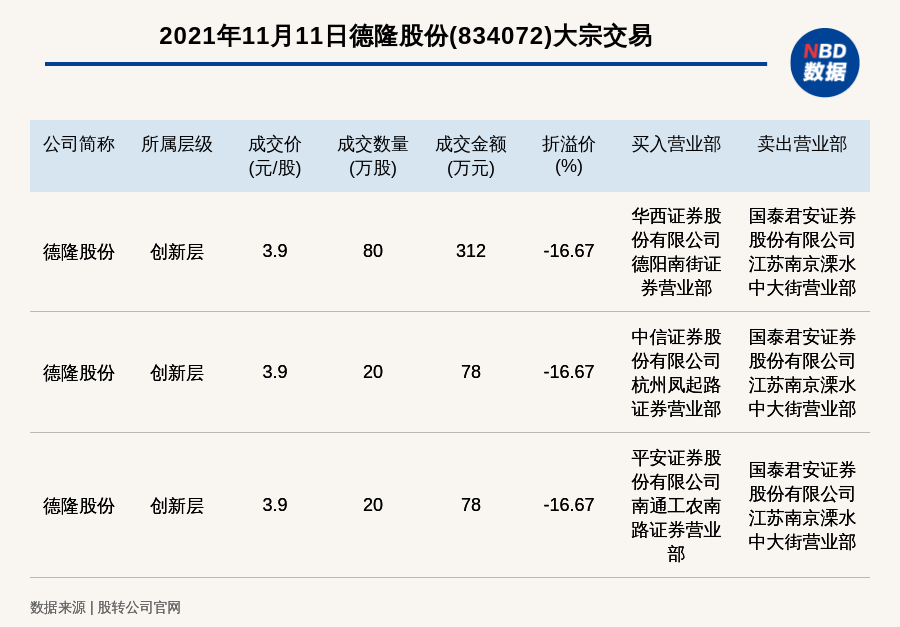 每经讯,2021年11月11日,新三板创新层公司德隆股份(834072)发生3笔大宗交易,总成交金额为468万元,成交金额最高的一笔成交价3.9元/股,成交数量80万股,成交金额312万元,折价16.67%。买入营业部是华西证券股份有限公司德阳南街证券营业部,卖出营业部是国泰君安证券股份有限公司江苏南京溧水中大街营业部。