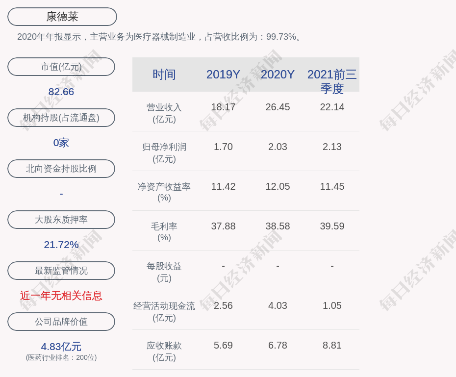 2020年年报显示,康德莱的主营业务为医疗器械制造业,占营收比例为:99.73%。